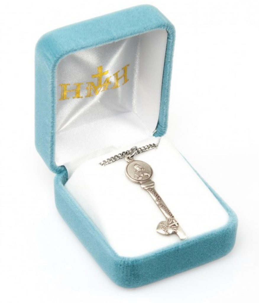 Remember your loved ones with this special Hearts of Sympathy key pendant. Made with solid .925 sterling silver, this die-struck medal is hand polished and engraved by New England Silversmiths. Comes with genuine rhodium plated curb chain and deluxe velvet gift box. A comforting reminder that they are with Jesus.