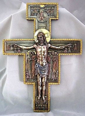 Amazing San Damiano cross From the Veronese Collection. Also known as the cross of Saint Francis. The beauty of solid bronze is now available in this bronze-finish resin, at a much more affordable price. Made to enjoy in church, chapel, home or office.