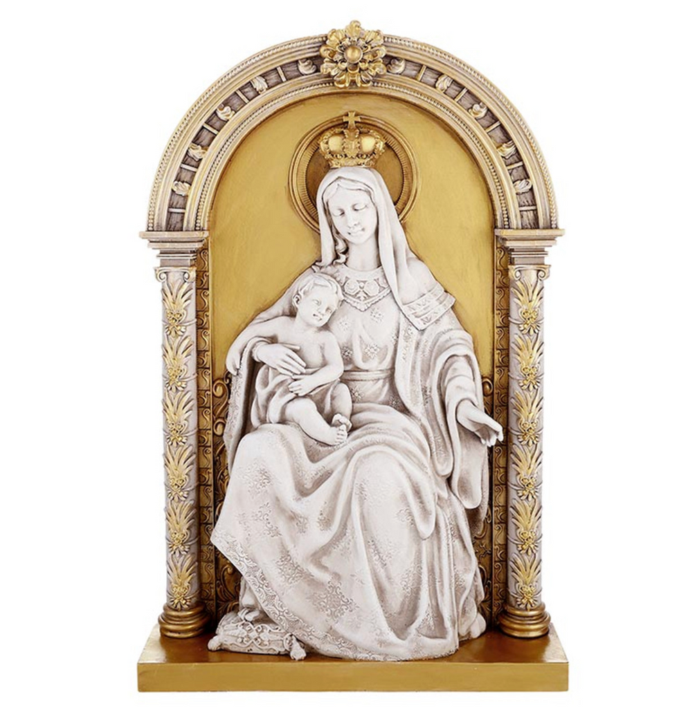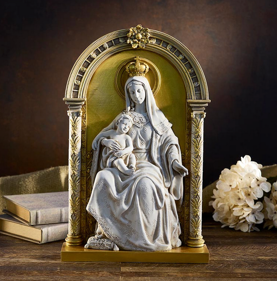 This elegant Madonna Mother of Good Counsel plaque, crafted from durable resin, measures 14-1/4" high by 9" wide and 2" deep. Its refined design makes it a graceful addition to any home or sacred space, serving as a beautiful tribute to guidance and wisdom. Perfect for those seeking a meaningful and enduring reminder of maternal care and counsel.