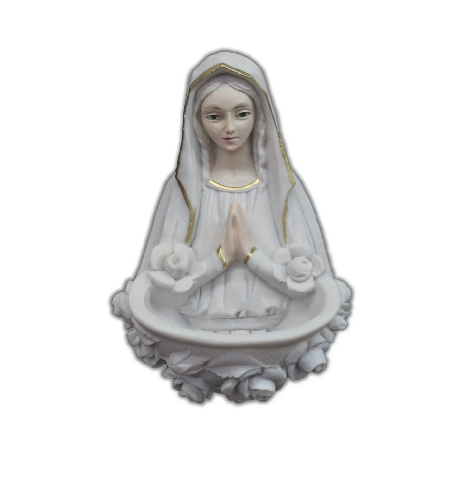 Bring a touch of divine elegance to your home with this charming Our Lady holy water font! Handcrafted in Italy, this 6.5" treasure features delicate hand-painted details and shimmering gold accents that catch the light beautifully. Perfect for entryways, bedrooms, or prayer spaces, it's a meaningful way to keep your faith close while adding a splash of spiritual style to any room. A wonderful gift for the devout or anyone who appreciates artisanal religious décor.