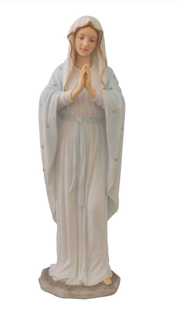 Behold the serene beauty of this stunning Madonna figurine from the Veronese Collection! Standing at 11.75 inches tall, this praying Virgin Mary is dressed in elegant white with absolutely gorgeous hand-painted gold and light blue accents that catch the light beautifully. Each detail is meticulously crafted to bring spiritual grace into your home or sacred space. Perfect for collectors of religious art, this piece makes a meaningful gift for those seeking daily inspiration and devotion. A timeless treasure that celebrates faith with artistic flair!